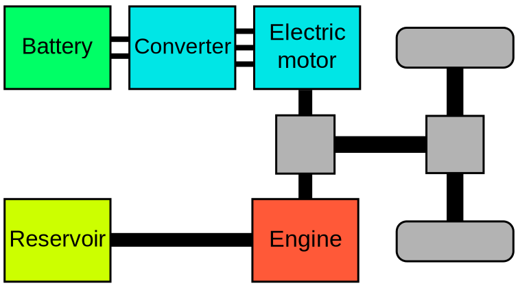 • Parallel hybrids have a diesel engine driving the propeller, and add an electric motor to also drive the propeller. Sometimes there is a clutch to disconnect the non-driving engine/motor.