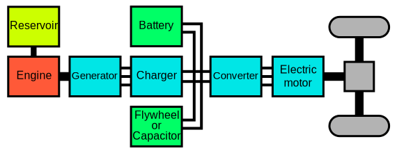 • Serial hybrids have only the electric motor connected to the propeller shaft and driving the boat. The diesel motor is separate and its purpose is be a source of electric power to the electric motor, usually buffered through a battery bank.